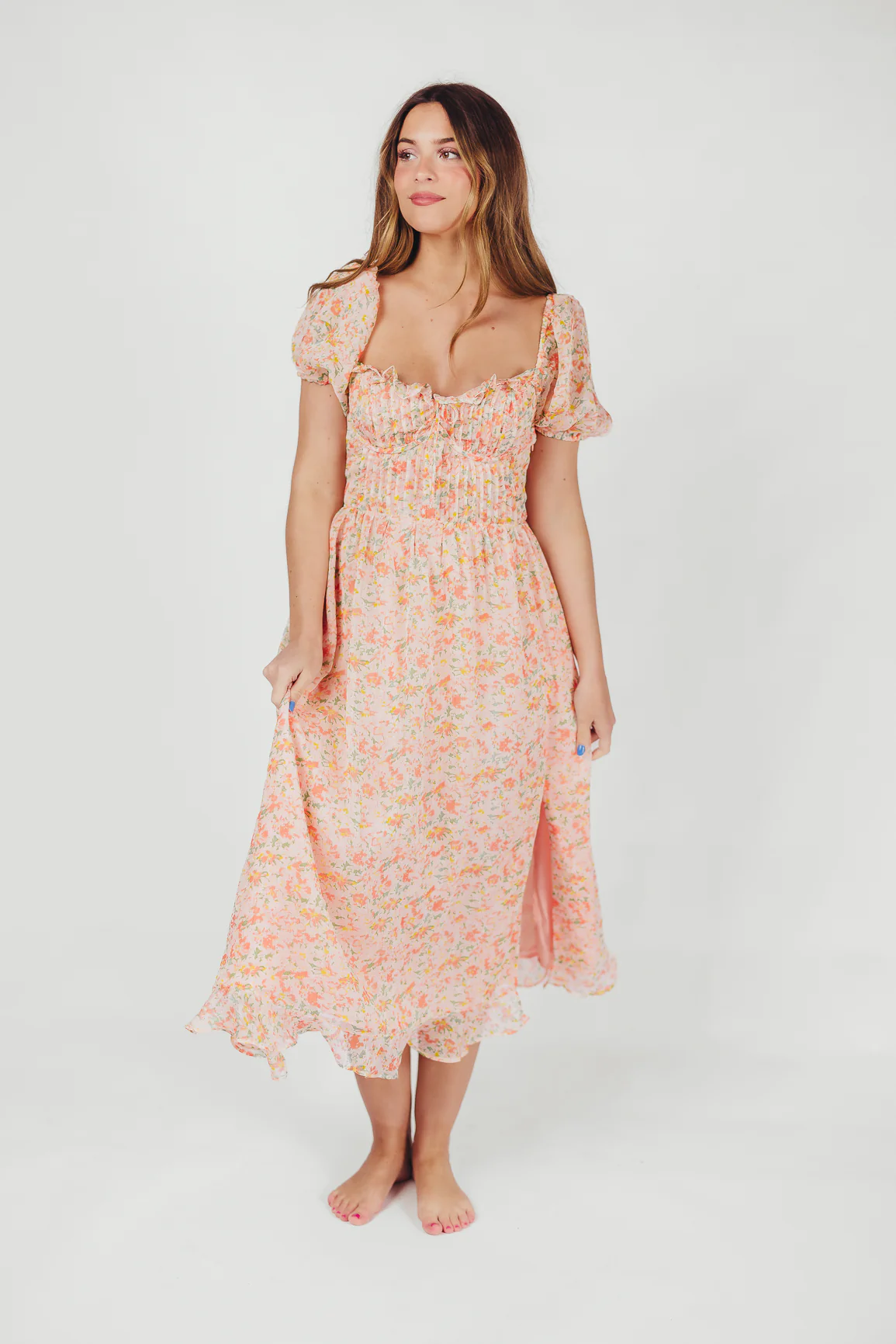 GARMENT DETAILS:Â Lightweight floral midi dress with a pleated, underwire bodice and sweetheart neckline. Features a ruffle and tie detail at the bodice, with a left leg slit above the knee, concealed side zipper, and smocked back panel. Lined.Â
