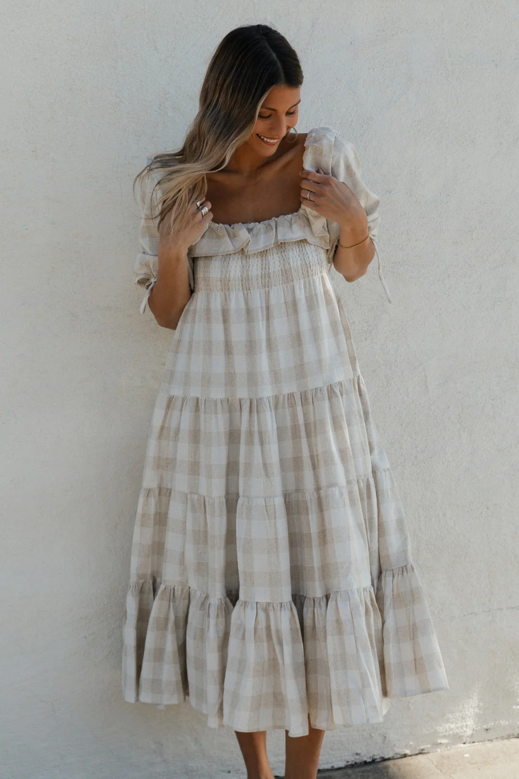 GARMENT DETAILS: Lightweight, premium cotton maxi dress with square neckline, 3/4 length balloon sleeves, and ruffle and tie accents. Features a smocked bodice and multi-tiered maxi skirt. Sleeves can be worn on or off the shoulder for versatility.