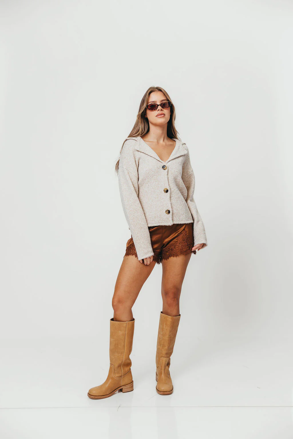 GARMENT DETAILS: Soft knit jacket with lapel collar, long sleeves, and functional front button placket.Â